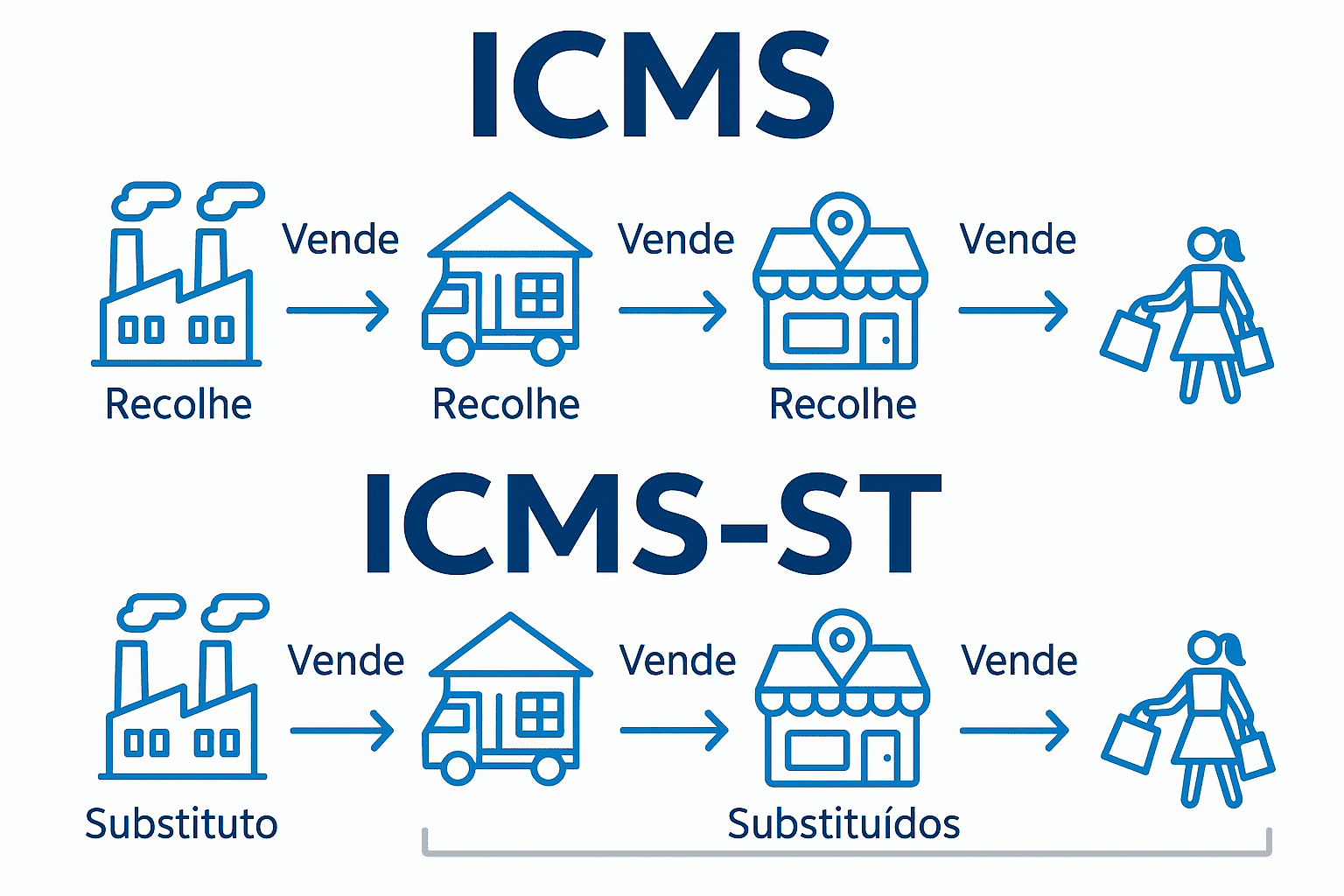 O ICMS-ST (Substituição Tributária) é um regime em que o imposto é antecipado por um único contribuinte da cadeia, geralmente o fabricante ou importador. Esse contribuinte, chamado de substituto tributário, recolhe o ICMS que seria devido por todas as empresas subsequentes — os chamados substituídos.