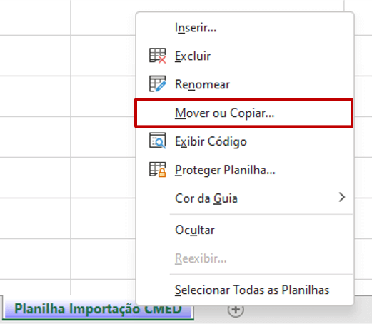 Clique com o botão direito do mouse sobre a aba “Planilha Importação CMED” e, em seguida, aparecerão algumas opções. Selecione a opção “Mover ou Copiar”.