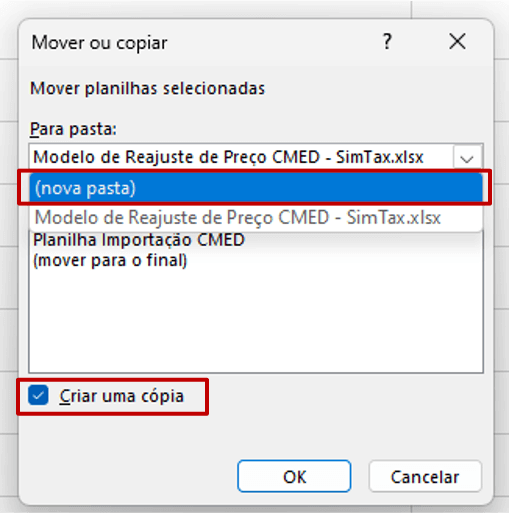 Após escolher a opção “Mover ou Copiar”, um painel será exibido.