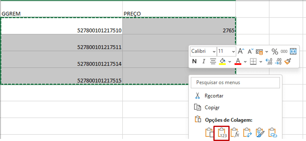- Clique com o botão direito do mouse sobre as células copiadas. No menu suspenso, selecione “Opções de colagem”. Escolha a opção que aparece com o ícone “123”, que indica colar apenas os valores.