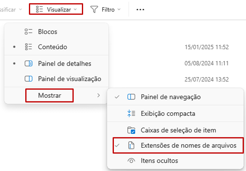 - Em seguida, selecione “Mostrar” e marque a opção “Extensões de arquivos”.