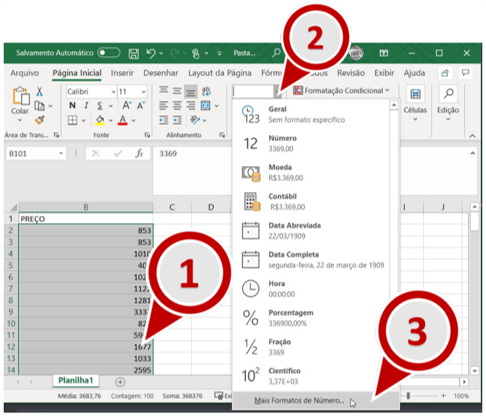 6. Agora selecione somente os números da coluna Preço, localize o Menu “Formatar Células” e selecione a opção “Mais Formatos de Número…”.