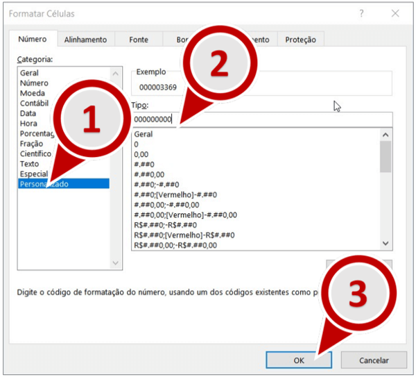 7. Na janela “Formatar Células”, localize o quadro Categoria e selecione a opção Personalizado. Em seguida localize o campo Tipo informe o valor 000000000 (9 zeros). Por fim, clique em OK.