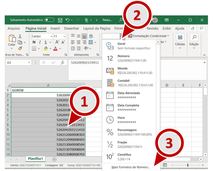 8. Selecione somente os números da coluna GGREM, localize o Menu “Formatar Células” e selecione a opção “Mais Formatos de Número…”.