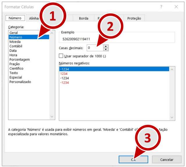9. Na janela “Formatar Células”, localize o quadro Categoria e selecione a opção Número. Em seguida localize o campo “Casas decimais:”, informe o valor 0. Por fim, clique em OK.
