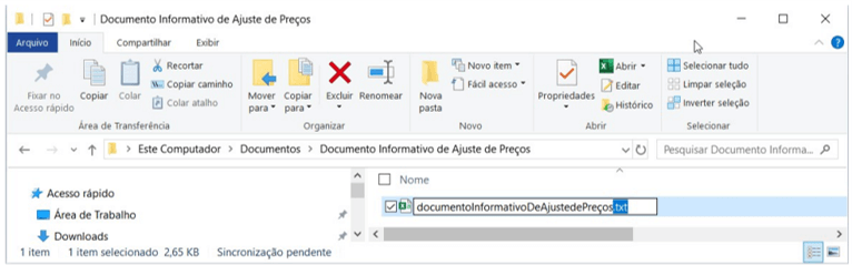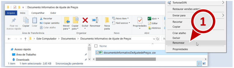 13. Abra o Windows Explorer e renomeie a extensão do arquivo de csv para txt. Por exemplo, se o seu arquivo foi nomeado como “documento_Informativo_de_Ajuste.csv”, renomeie para “documento_Informativo_de_Ajuste.txt”.
