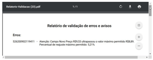 c) Erros de conteúdo: arquivo atende todas as exigências de forma da lista de especificações do arquivo informativo de preço, mas contém apresentações cujos preços ajustados são superiores ao ajuste máximo permitido. Neste caso o SAMMed apresentará um conjunto de mensagem informando as apresentações cujos preços excedem o limite máximo esperado para a apresentação e disponibilizará a opção Validar. Ao clicar nesta última opção será disponibilizado o Relatório de Validação, contendo uma relação de todas as apresentações para os quais se identificou alguma inconformidade. Neste caso não será possível enviar os dados até que todos os preços ajustados se adequem à um valor igual ou menos ao preço máximo determinado pelo nível de ajuste para a apresentação. A adequação dos preços poderá ser realizada através da edição dos preços na própria página, ou atravésda importaçãode um novoarquivocorrigido.