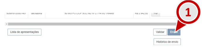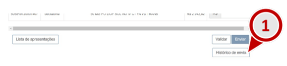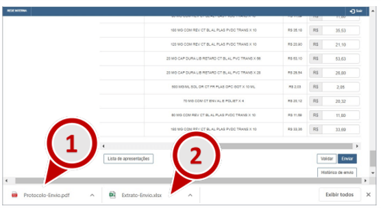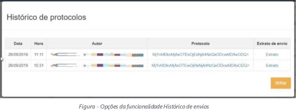 b) Na janela Histórico de protocolos, será possível realizar novamente o download do Extrato de Envio (Extrato-Envio.xlsx) clicando em uma das entradas da coluna Extrato de envio e o Protocolo de Envio (Protocolo-Envio.pdf) clicando em um dos registros de envio da coluna Protocolo.