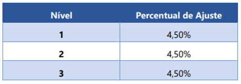 Em 2024, o ajuste foi uniforme (4,50%) para todos os níveis, o que reforça a possibilidade de continuidade do modelo único.