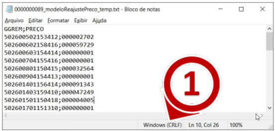 a) Verifique no rodapé do Bloco de Notas (passo 1) o tipo de quebra de linha utilizada no arquivo.