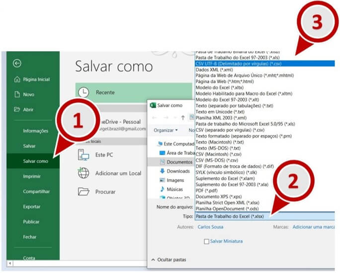 12. Salve o arquivo no formato CSV UTF-8. Para isso clique em Arquivo, em seguida selecione Salvar Como, em seguida selecione uma pasta e na janela Salvar como, localize o campo tipo e selecione a opção CSV UTF-8 (Delimitado por vírgulas).